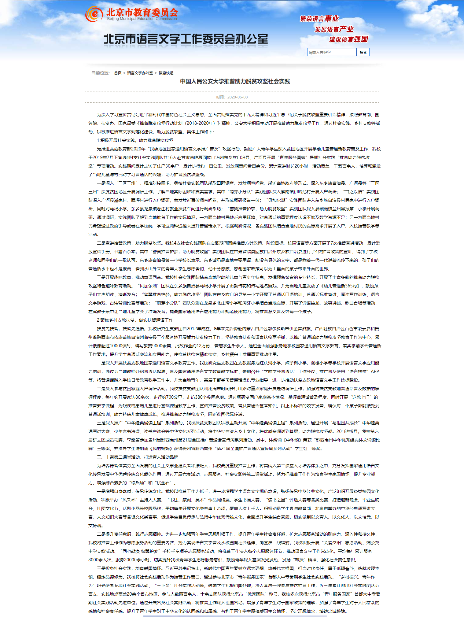 近日,北京市教委语言文字办公室官方网站发布《365best体育官网登录推普助力脱贫攻坚社会实践》一文,对公司在社会实践推普、支教扶贫推普、第二课堂活动推普等工作进行了宣传报道。