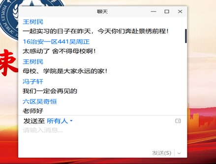 2016级治安一区队杨心开同学代表治安公司2020届全体毕业生进行了发言,向四年来无私奉献的各位领导和老师致以诚挚感谢,四年的公大生活使同学们培养了高度的政治意识、具备了杰出的综合素质、获取了丰富的专业知识,全体毕业生都将把四年的藏蓝岁月视作生命中最为珍贵的回忆。