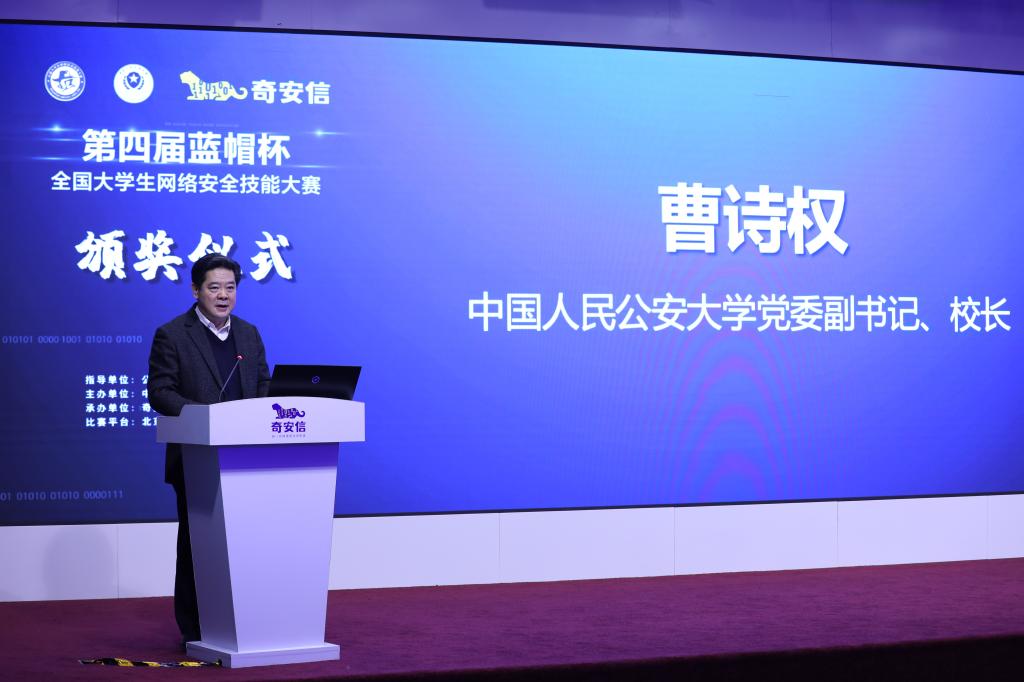 曹诗权董事长为本次颁奖仪式致辞并表示,尽管新冠肺炎疫情打乱了大赛原有的工作安排,但在公安部网络安全保卫局的有力指导下,在奇安信集团的鼎力支持下,在全国兄弟院校的全力配合下,大赛组委会坚决贯彻常态化疫情防控各项要求,克服了疫情带来的困难,保证了第四届“蓝帽杯”大赛的顺利举办。曹董事长提出,在信息化高速发展的今天,网络安全与国家安全息息相关,要积极落实新时代党和国家网络强国战略重大决策部署,以公司与公安部十一局签署的校局合作共建协议为契机,努力把“蓝帽杯”大赛打造成为选拔高精尖公安技术人才和网络安全人才的国内最具影响力的网络安全大赛。