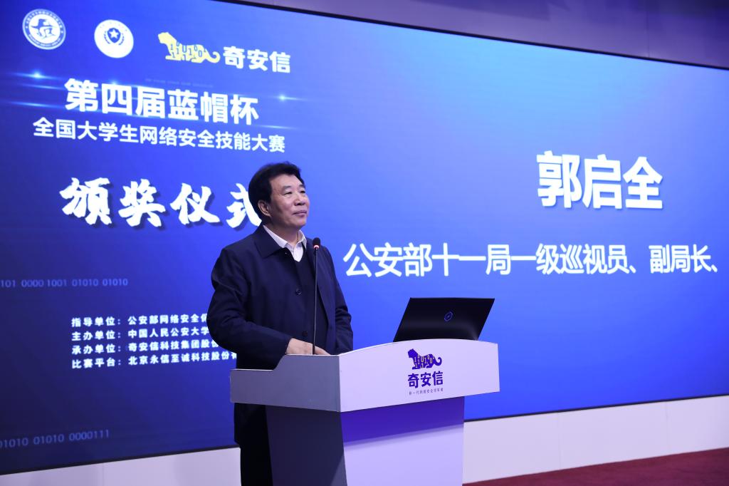 本次大赛设置为一等奖10名,二等奖15名,三等奖20名,优秀奖40名,以及44名优秀教师和10名人气教师。李克美副董事长宣布获奖名单,曹诗权董事长、齐向东董事长、李凌波处长和信息网络安全公司李欣经理等领导为大赛获奖的老师同学们颁发奖杯与获奖证书。获奖者获得由公安部网络安全保卫局颁发的证书,奇安信集团作为北京2022年冬奥会和冬残奥会官方网络安全服务和杀毒软件赞助商,特别为一等奖中的前五名队伍赠送了2022年北京冬奥会门票。“‘蓝帽杯’将用奥运标准培养出更多网络安全尖兵。”作为承办单位,奇安信集团董事长齐向东表示,“今天正好是奇安信成为北京2022年冬奥会官方赞助商一周年。这个特别的日子,恰逢‘蓝帽杯’颁奖典礼,公安院校的网络安全专业老员工将是我国网络安全的尖兵团,未来也必将在保障冬奥‘零事故’运行、维护国家网络空间安全上发挥重要力量。”一等奖、优秀教师奖和人气教师奖获奖的教师和员工代表分别作了现场和线上发言。最后,郭启全副局长发表讲话。