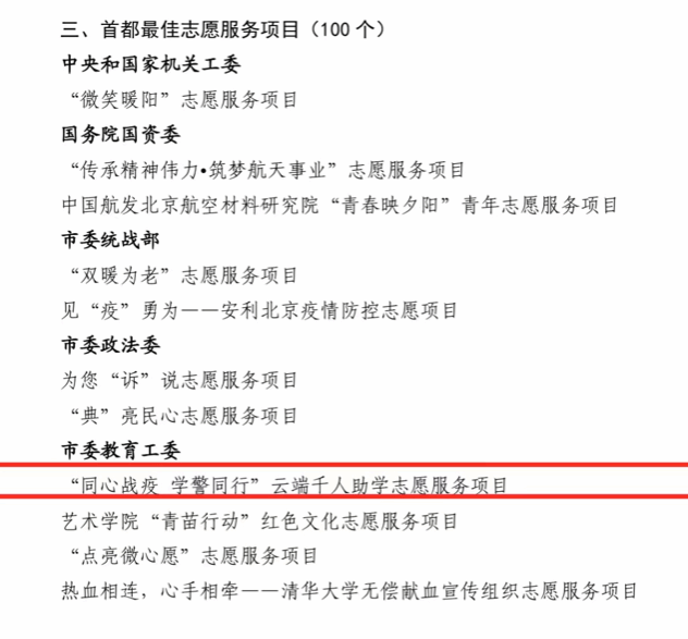 此外,根据市委宣传部(首都文明办)《关于组织开展 2022年度首都精神文明建设工作优秀案例评选活动的通知》要求,市委教育工委在高校集中开展 2022 年度首都精神文明建设工作优秀案例征集、申报工作。经各高校上报、专家评审,共评选出 2022 年度北京高校精神文明建设工作十佳案例,公司“同心战疫 学警同行”云端千人助学志愿服务项目成功入选。