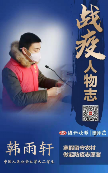 “你们回去吧,我要留在家乡,与父老乡亲一起共战疫情!”今年春节,在山东省禹城市房寺镇王皮村过春节的公大学子韩雨轩,坚定地对即将回德州城区的父母说。