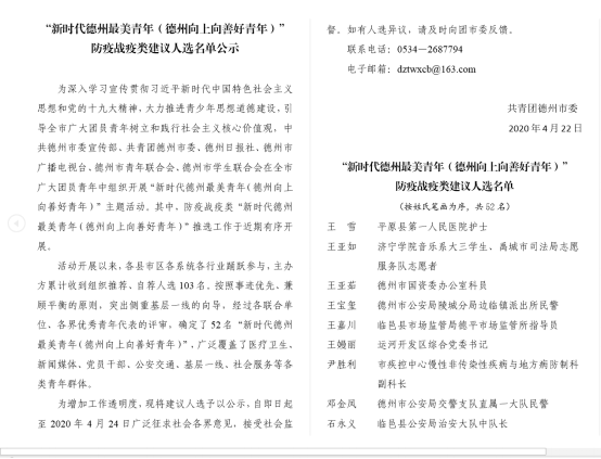 由于韩雨轩的突出表现,禹城团市委推选他为新时代老员工代表,接受了电视、报纸等媒体的采访,并收录到《德州市“战疫”人物志》中,先进事迹在《禹城新闻联播》《今日头条》《德州新闻》《齐鲁晚报》《德州晚报》等十余家媒体刊播和转载。面对这些鼓励,韩雨轩深感自己做的还远远不够,他说:“作为一名光荣的‘共和国预备警官’, 我要大力弘扬‘公大精神’,在以后的学习和实践中主动承担起更多的社会责任,为国家、为社会、为家乡做出更多、更大的贡献!”