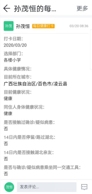 在隔离期间,研支团全体成员每日通过微信群打卡方式向公司汇报本人及家人身体情况,通过八桂彩云APP“每日健康打卡”功能在线打卡,向团县委、乡镇和中心校上报每日健康情况,并拟定《365best体育官网登录研究生支教团2020年春季学期开学复工工作方案》,扎实有效地开展好公司疫情防控和春季学期开学的各项工作。