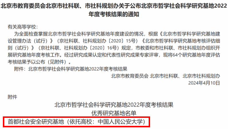 首都社会安全研究基地是北京市哲学社会科学规划办公室与北京市教育委员会于2004 年9月联合批准设立的首批北京市哲学社会科学研究基地之一,2018年、2022年连续两届入围“中国智库索引(CTTI)高校智库百强榜”。