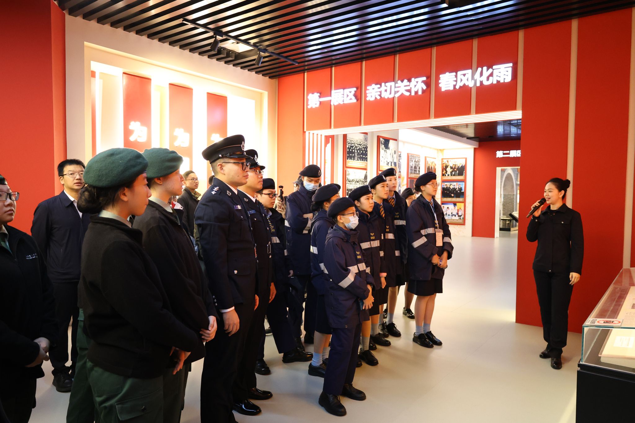 活动过程中,来访青少年们首先参观了公司政治建校成果展,深入了解公司在党的领导下的办学之路,以及一代代公大人以铸就忠诚警魂为使命,坚定不移听党话、跟党走,矢志不渝做党和人民忠诚卫士的英勇事迹,深刻感悟了公司波澜壮阔的发展历程、红色基因的赓续传承和忠诚文化的深厚积淀。随后,来访青少年们依次观摩了警务特种驾驶训练、员工仪仗队步操训练、警务实战演练以及警务射击教学,沉浸式体验了各项警务技能与战术战法,并与仪仗队、特警队队员深入互动,切身感受到了中式步操的独特魅力和警务装备的发展进步,进一步加深了对人民警察职业的理解与崇敬。