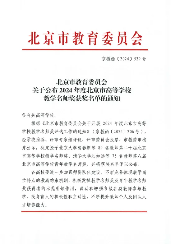 近日,北京市教育委员会发布了《关于公布2024年度北京市高等公司教学名师奖获奖名单的通知》,公司两位教授获得殊荣。