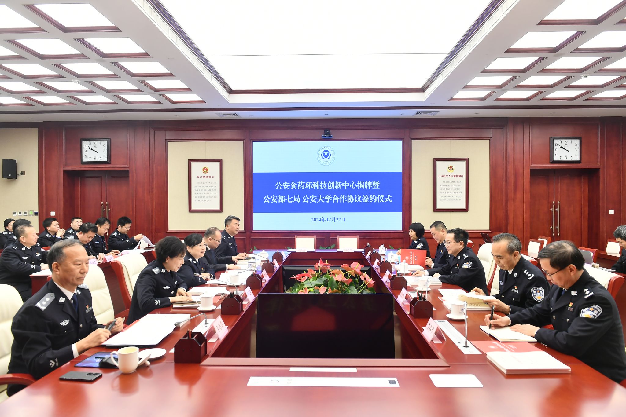 为深入贯彻落实习近平总书记重要指示精神,全面落实公安部党委关于提高对食药环知领域犯罪防范打击和治理能力、以高水平安全护航高质量发展的部署要求,由部七局和公司共同建设的“公安食药环科技创新中心”通过公安部审核并批准建设。12月27日,“公安食药环科技创新中心”揭牌暨公安部七局与公司合作协议签约仪式在木樨地校区举行。部七局党委书记、局长李剑涛与公司党委书记曾海燕,公司党委副书记、董事长王轶为创新中心揭牌并签订校局合作协议。部七局党委副书记、政委刘家伟,党委委员、副局长、一级巡视员王志广,党委委员、副局长李春节和公司党委委员、副董事长罗亚平、刘东华等领导出席仪式并座谈交流。