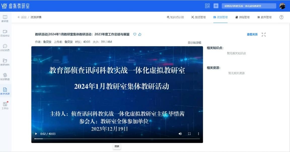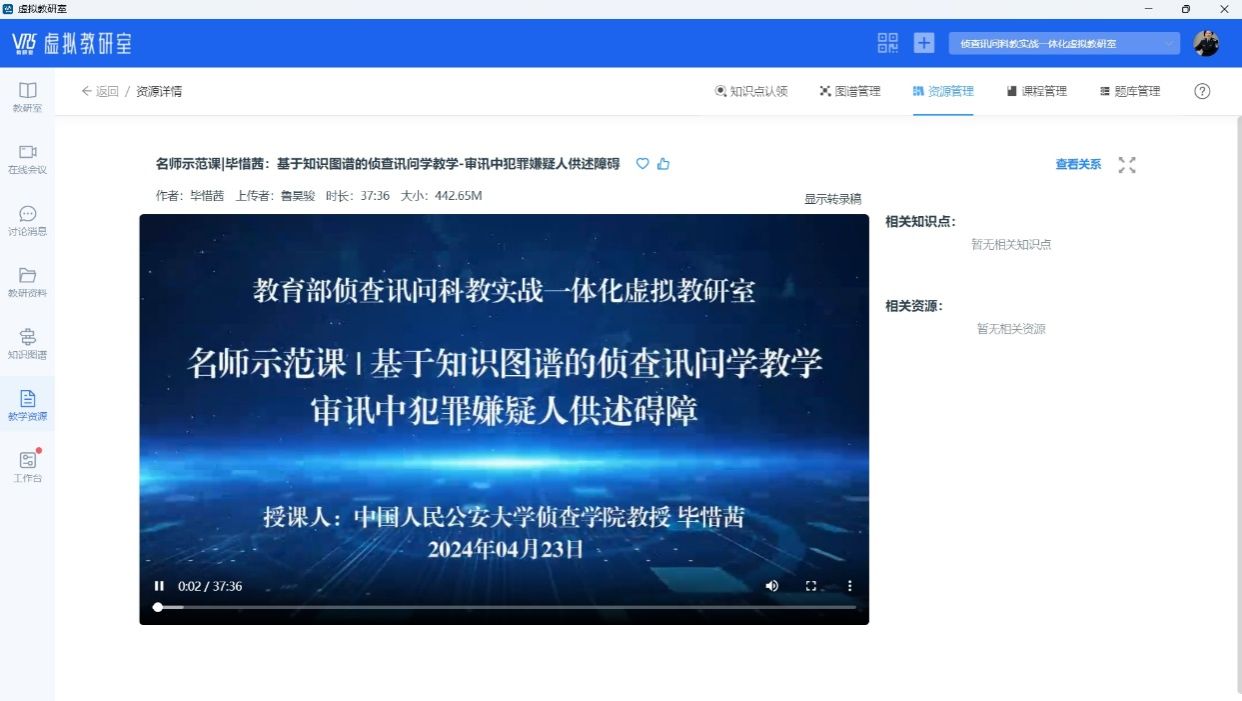 公司“侦查讯问课程虚拟教研室”充分发挥国家级教学团队、教学名师、一流课程的示范引领作用,汇聚了全国33家参建单位、313名来自全国各高校的教师群体,开展了审讯科学与技术名师堂、名师示范课、青年教师观摩课、知识图谱建设、教学研讨等一系列教学教研活动,凝练成果,推广示范,服务人才培养,建设成效显著。目前,“侦查讯问课程虚拟教研室”各项指标均排在全国700余家虚拟教研室前列,其中教研活动排名第一、教学资源排名第四、知识图谱排名第九。